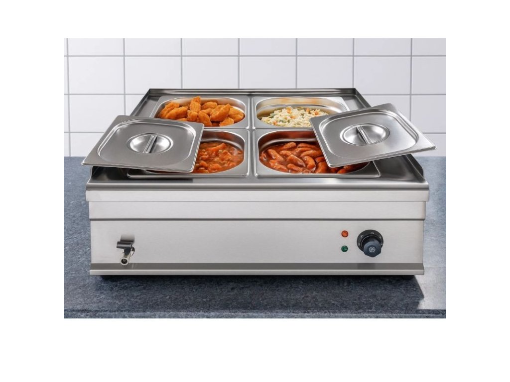 Tato profesionální elektrická vodní lázeň (bain-marie) je navržena pro udržování hotových pokrmů při optimální teplotě během výdeje. Je ideálním pomocníkem pro restaurace, kantýny, výdejny jídel, cateringy či hotelové provozy, kde je potřeba zajistit trvalé tepelné podávání jídel bez jejich převaření nebo vysychání.