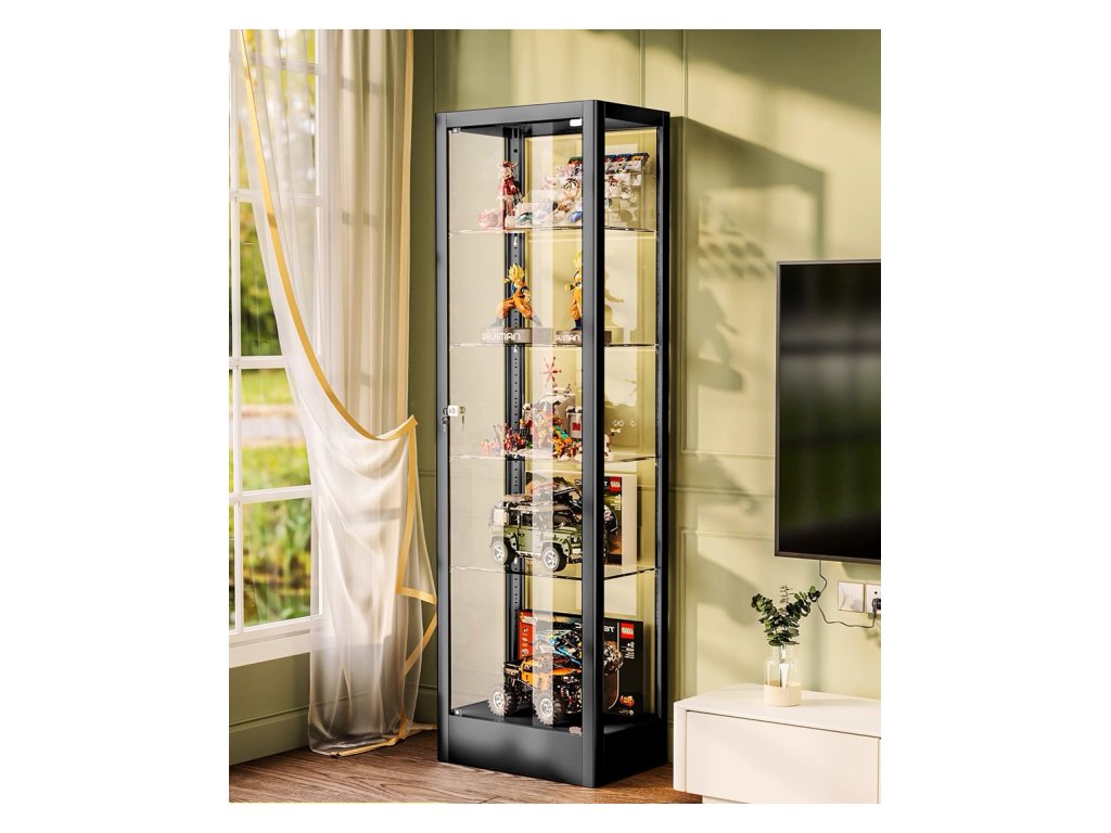 Elegantní prosklená vitrína v černém provedení nabízí prostor pro vystavení dekorací, výrobků, dokumentů i trofejí. Díky pevné kovové konstrukci, proskleným křídlovým dveřím a stavitelným skleněným policím je ideální pro kanceláře, recepce, školy, showroomy i obchody. Dvířka jsou opatřeny cylindrickým zámkem se dvěma klíči. Sokl dodává celé vitríně stabilitu i čistý elegantní vzhled.