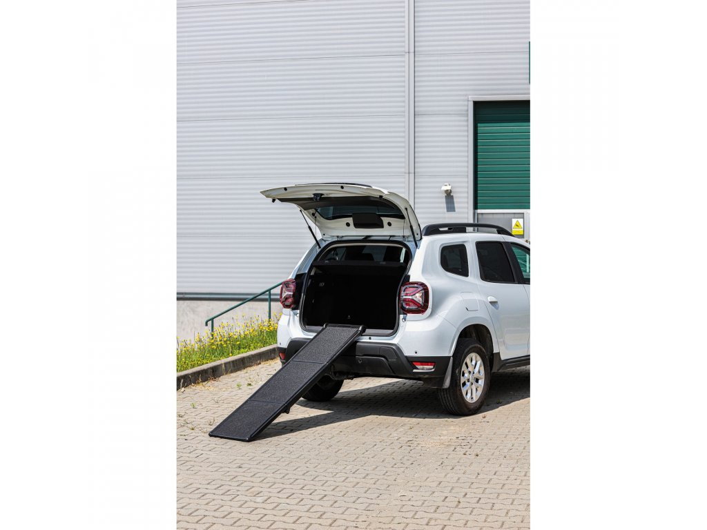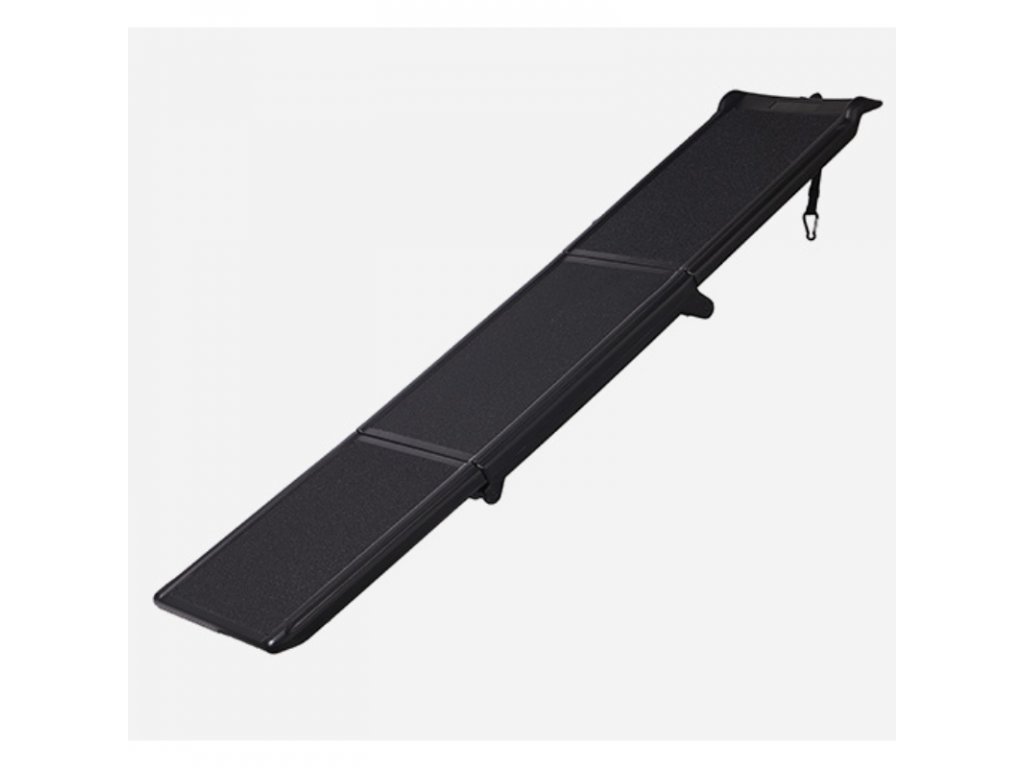Skládací rampa pro psy je ideálním pomocníkem každého chovatele, který chce svému mazlíčkovi usnadnit nastupování a vystupování na vyvýšenou plochu, například do kufru automobilu. Skládá se ze tří dílů, které na sebe přímo navazují a mezi sebou jsou propojeny kloubovým mechanismem s aretací v rozevřeném stavu. Plocha této rampy je vybavena zdrsněným protiskluzovým povrchem, který psovi umožní ještě bezpečnější pohyb. Na obou koncích rampy se nacházejí gumové dosedací plochy. Je také vybavena karabinou, kterou lze použít k jejímu kotvení, případně i přenášení. Využití rampy doporučujeme především u psů, kteří trpí artrózou či artritidou, případně také jako prevenci těmto onemocněním.