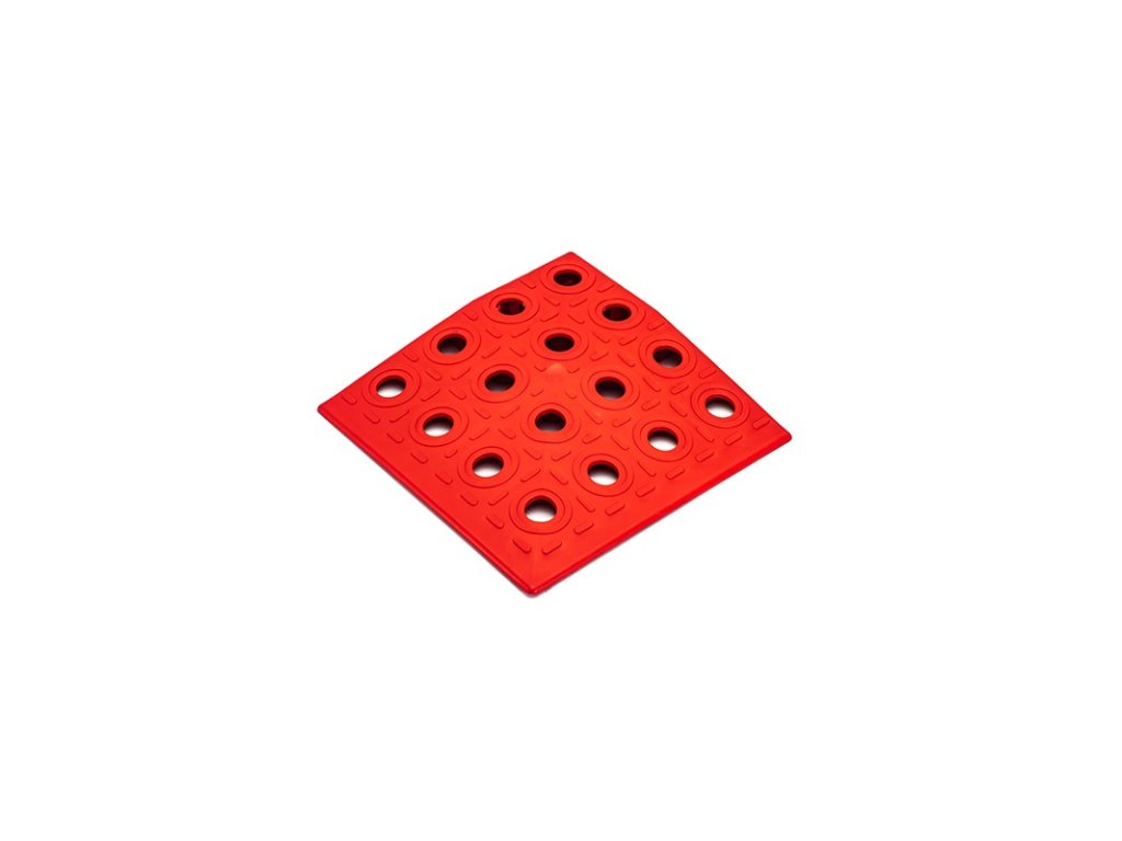 Nájezd rohový 137x137x16 mm je doplňujícím prvkem pro ukončení podlahové podlahy v rozích, kde na sebe navazují rovné nájezdy ze dvou stran. Plynulý nájezd zabezpečí bezpečný vstup a nájezd na plochu. Povrch rohu je stejně děrovaný jako základní deska, spodní strana je žebrovaná a propojená kanály, které zajišťují rychlý a trvalý odvod vody pod povrchem podlahy. Barevnou kombinací nájezdů a rohů je možné označit okraje plochy v souladu s bezpečnostními předpisy (kombinace žluté a černé). Součástí dodávky jsou 4x4 ks spojek pro spojení s dalšími prvky.