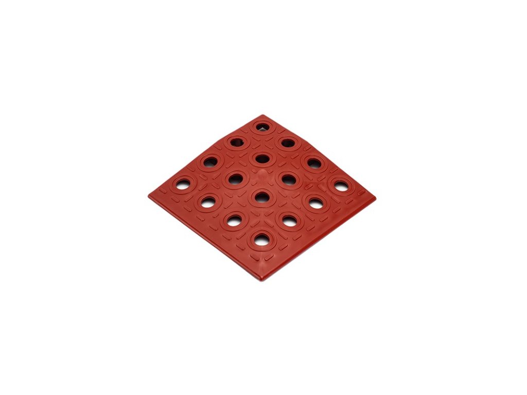 Nájezd rohový 137x137x16 mm je doplňujícím prvkem pro ukončení podlahové podlahy v rozích, kde na sebe navazují rovné nájezdy ze dvou stran. Plynulý nájezd zabezpečí bezpečný vstup a nájezd na plochu. Povrch rohu je stejně děrovaný jako základní deska, spodní strana je žebrovaná a propojená kanály, které zajišťují rychlý a trvalý odvod vody pod povrchem podlahy. Barevnou kombinací nájezdů a rohů je možné označit okraje plochy v souladu s bezpečnostními předpisy (kombinace žluté a černé). Součástí dodávky jsou 4x4 ks spojek pro spojení s dalšími prvky.