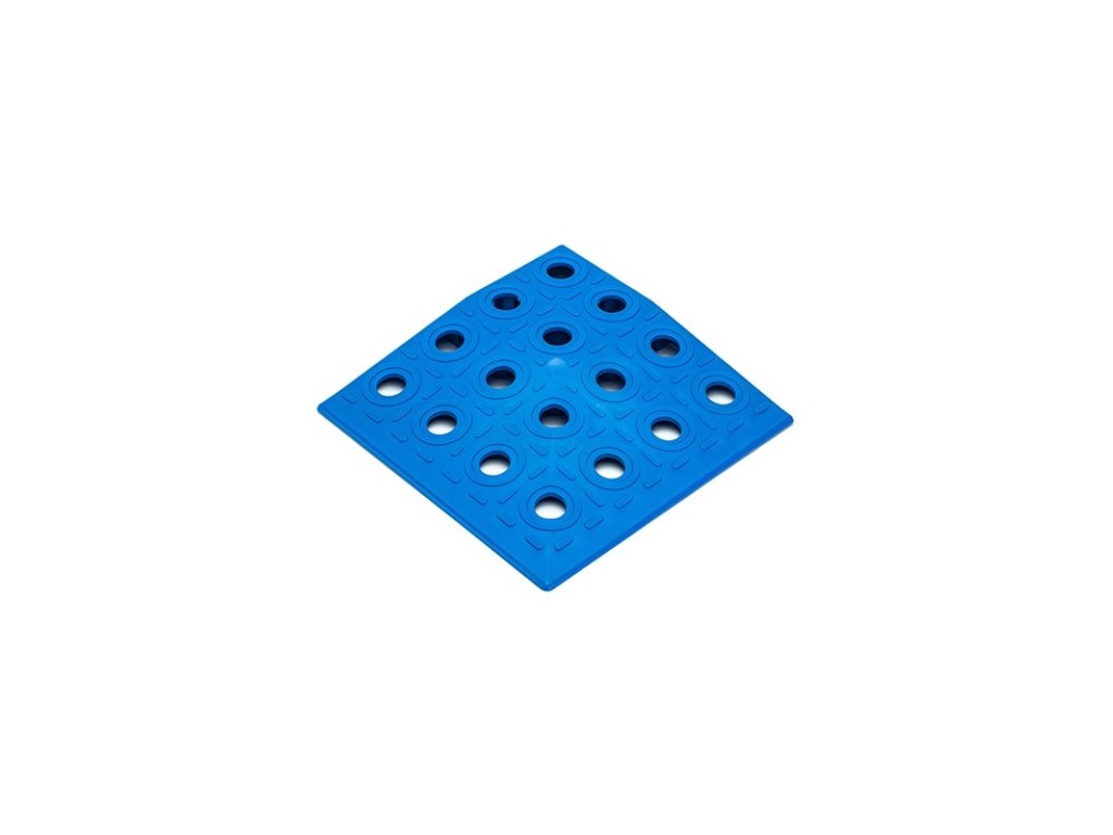 Nájezd rohový 137x137x16 mm je doplňujícím prvkem pro ukončení podlahové podlahy v rozích, kde na sebe navazují rovné nájezdy ze dvou stran. Plynulý nájezd zabezpečí bezpečný vstup a nájezd na plochu. Povrch rohu je stejně děrovaný jako základní deska, spodní strana je žebrovaná a propojená kanály, které zajišťují rychlý a trvalý odvod vody pod povrchem podlahy. Barevnou kombinací nájezdů a rohů je možné označit okraje plochy v souladu s bezpečnostními předpisy (kombinace žluté a černé). Součástí dodávky jsou 4x4 ks spojek pro spojení s dalšími prvky.