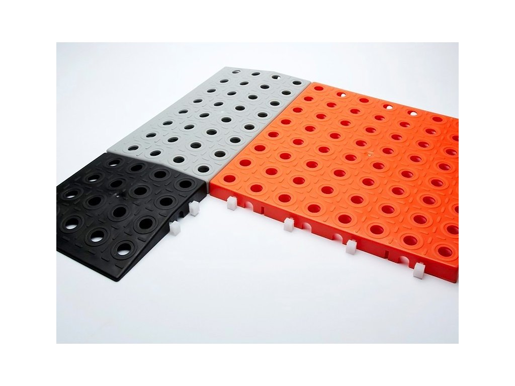 Elementárním prvkem systému je deska 250x250mm. Provedení povrchu všech dílů je protiskluzové, v povrchu jsou otvory o průměru 12mm, výška desek je 16mm. Vytvoření nájezdových hran se řeší pomocí rovného a rohového nájezdu. Jednotlivé díly systému se spojují plastovými spojkami, které jsou v příslušném počtu u každého modulu zahrnuty v ceně. Podlahový systém je možno vrstvit na sebe a tím vytvářet nájezdové rampy různé výšky i délky.