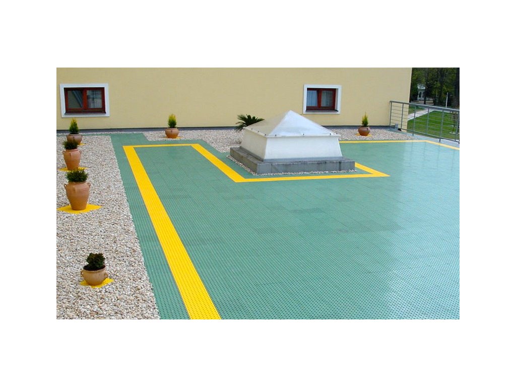 Nájezd rohový 137x137x16 mm je doplňujícím prvkem pro ukončení podlahové podlahy v rozích, kde na sebe navazují rovné nájezdy ze dvou stran. Plynulý nájezd zabezpečí bezpečný vstup a nájezd na plochu. Povrch rohu je stejně děrovaný jako základní deska, spodní strana je žebrovaná a propojená kanály, které zajišťují rychlý a trvalý odvod vody pod povrchem podlahy. Barevnou kombinací nájezdů a rohů je možné označit okraje plochy v souladu s bezpečnostními předpisy (kombinace žluté a černé). Součástí dodávky jsou 4x4 ks spojek pro spojení s dalšími prvky.