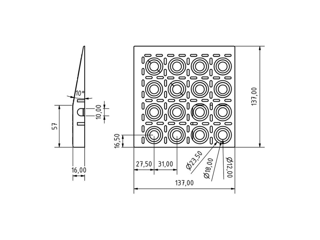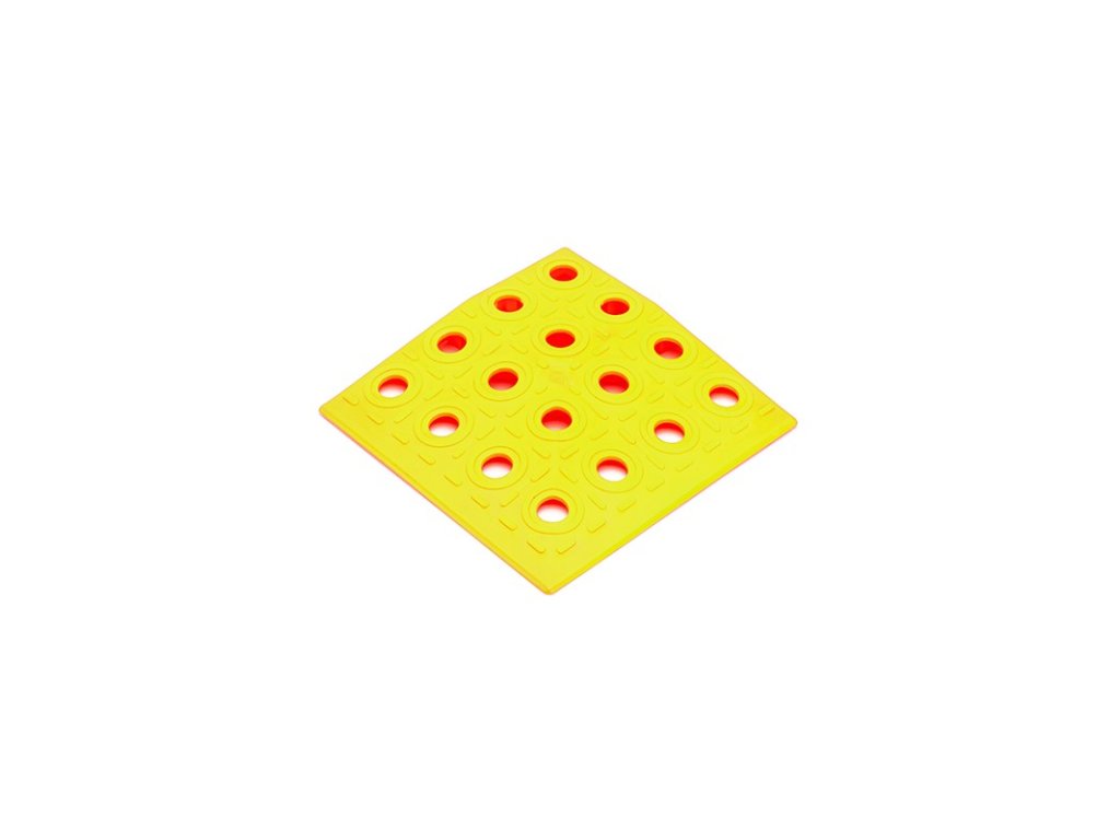 Nájezd rohový 137x137x16 mm je doplňujícím prvkem pro ukončení podlahové podlahy v rozích, kde na sebe navazují rovné nájezdy ze dvou stran. Plynulý nájezd zabezpečí bezpečný vstup a nájezd na plochu. Povrch rohu je stejně děrovaný jako základní deska, spodní strana je žebrovaná a propojená kanály, které zajišťují rychlý a trvalý odvod vody pod povrchem podlahy. Barevnou kombinací nájezdů a rohů je možné označit okraje plochy v souladu s bezpečnostními předpisy (kombinace žluté a černé). Součástí dodávky jsou 4x4 ks spojek pro spojení s dalšími prvky.
