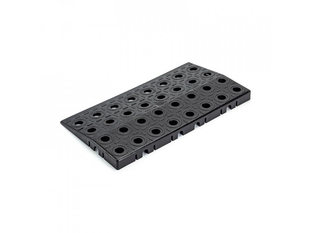 Nájezd rovný 250x137x16 mm slouží pro ukončení plastové podlahové plochy po stranách. Plynulý nájezd zabezpečí bezpečný vstup a nájezd na plochu. Povrch nájezdu je stejně děrovaný jako základní deska, spodní strana je žebrovaná a propojená kanály, které zajišťují rychlý a trvalý odvod vody pod povrchem podlahy. Barevnou kombinací nájezdů je možné současně označit okraje plochy v souladu s bezpečnostními předpisy (kombinace žluté a černé). Součástí dodávky jsou 6x4 spojky pro spojení s dalšími prvky. Výhodou systému je, že při poškození spojky se tato jednoduše vymění a nemusí se měnit celý díl. Na okraj dlouhý 1 metr jsou zapotřebí 4 ks nájezdů.