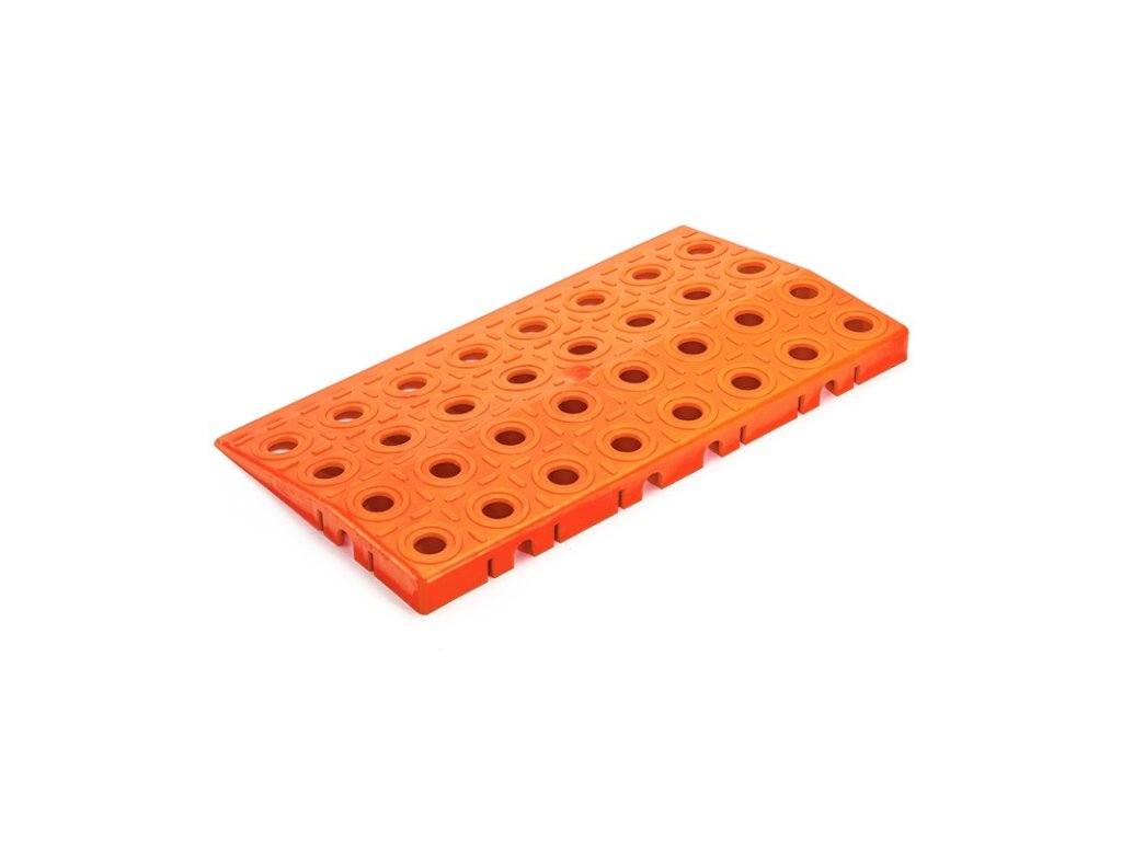 Nájezd rovný 250x137x16 mm slouží pro ukončení plastové podlahové plochy po stranách. Plynulý nájezd zabezpečí bezpečný vstup a nájezd na plochu. Povrch nájezdu je stejně děrovaný jako základní deska, spodní strana je žebrovaná a propojená kanály, které zajišťují rychlý a trvalý odvod vody pod povrchem podlahy. Barevnou kombinací nájezdů je možné současně označit okraje plochy v souladu s bezpečnostními předpisy (kombinace žluté a černé). Součástí dodávky jsou 6x4 spojky pro spojení s dalšími prvky. Výhodou systému je, že při poškození spojky se tato jednoduše vymění a nemusí se měnit celý díl. Na okraj dlouhý 1 metr jsou zapotřebí 4 ks nájezdů.
