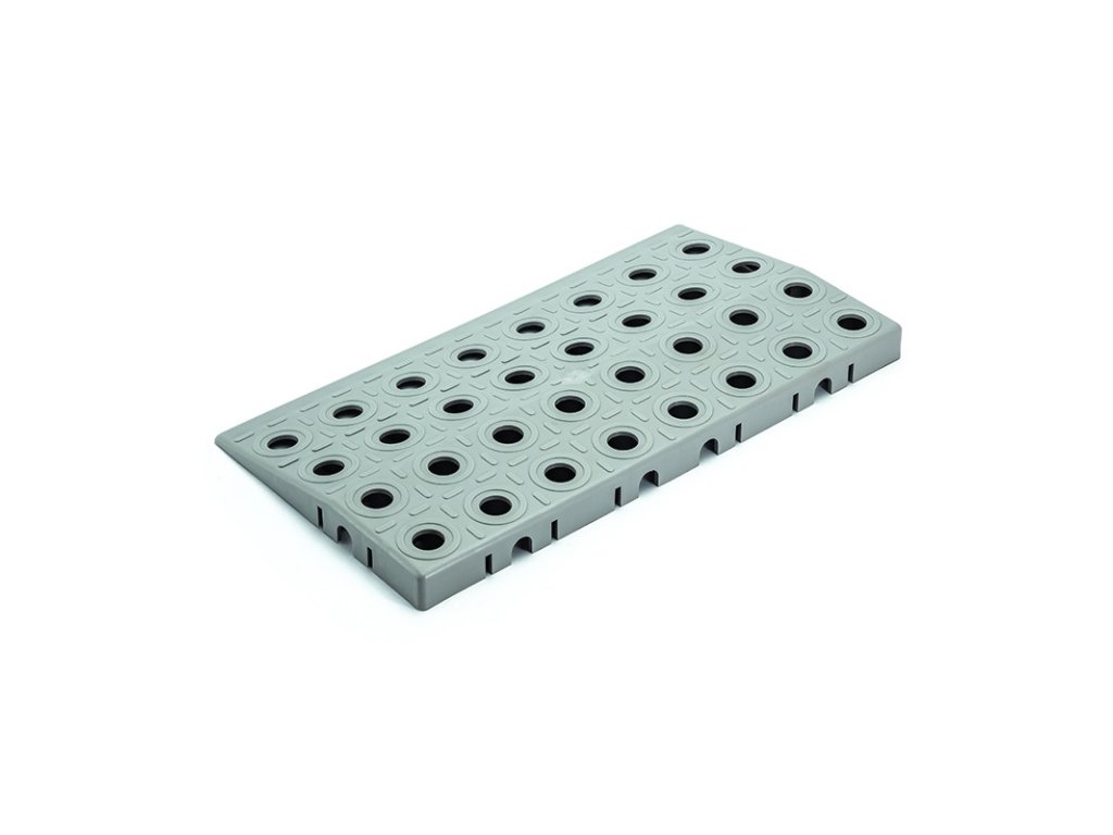 Nájezd rovný 250x137x16 mm slouží pro ukončení plastové podlahové plochy po stranách. Plynulý nájezd zabezpečí bezpečný vstup a nájezd na plochu. Povrch nájezdu je stejně děrovaný jako základní deska, spodní strana je žebrovaná a propojená kanály, které zajišťují rychlý a trvalý odvod vody pod povrchem podlahy. Barevnou kombinací nájezdů je možné současně označit okraje plochy v souladu s bezpečnostními předpisy (kombinace žluté a černé). Součástí dodávky jsou 6x4 spojky pro spojení s dalšími prvky. Výhodou systému je, že při poškození spojky se tato jednoduše vymění a nemusí se měnit celý díl. Na okraj dlouhý 1 metr jsou zapotřebí 4 ks nájezdů.