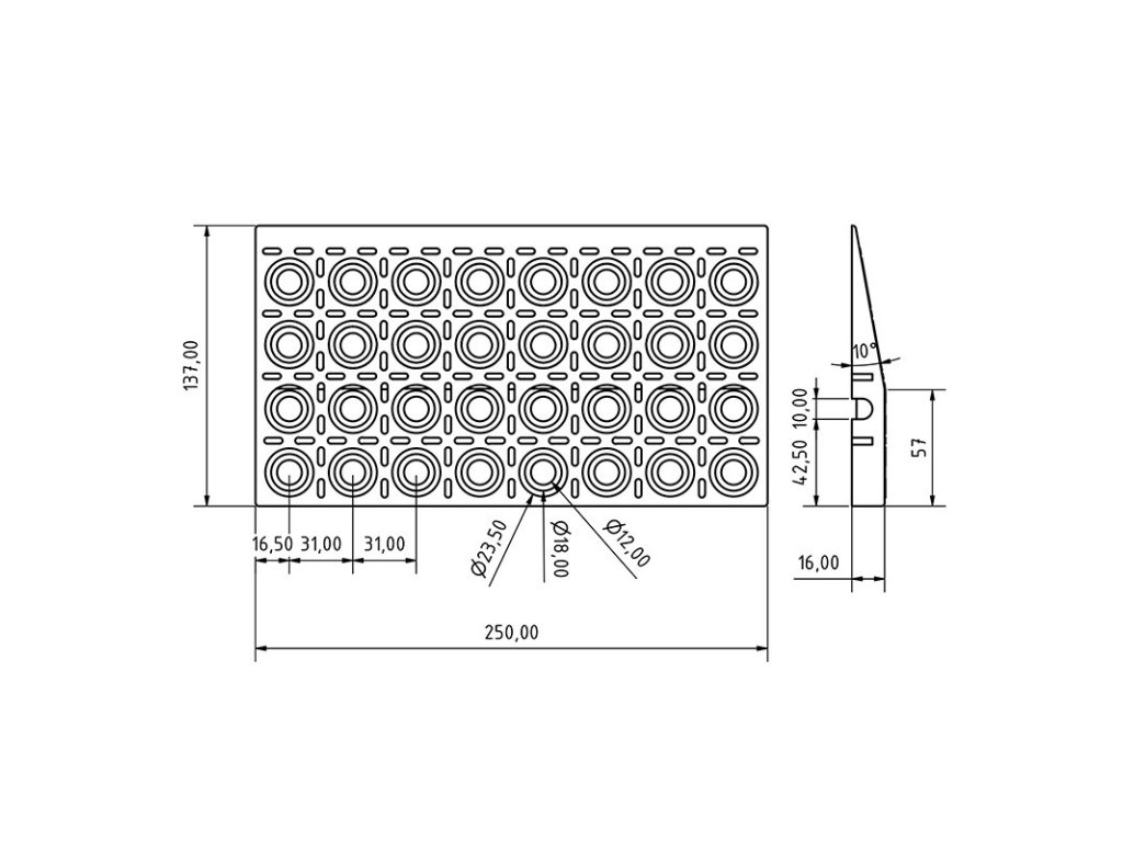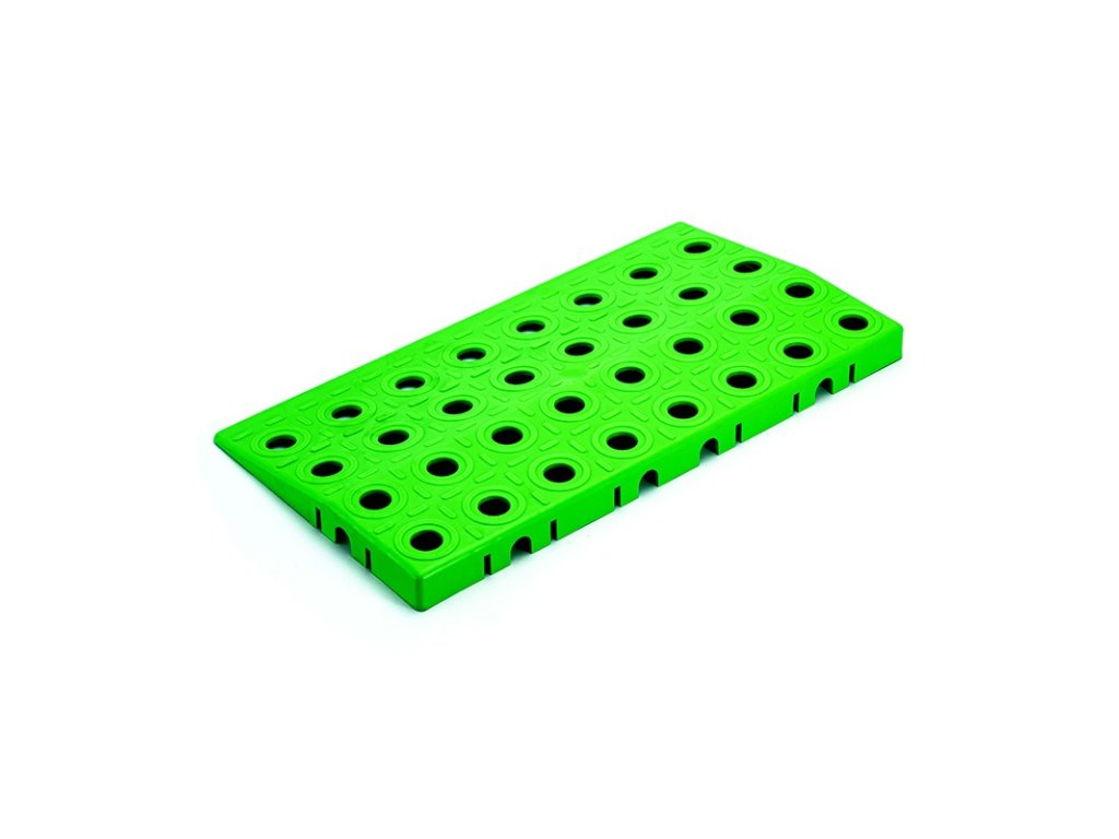 Nájezd rovný 250x137x16 mm slouží pro ukončení plastové podlahové plochy po stranách. Plynulý nájezd zabezpečí bezpečný vstup a nájezd na plochu. Povrch nájezdu je stejně děrovaný jako základní deska, spodní strana je žebrovaná a propojená kanály, které zajišťují rychlý a trvalý odvod vody pod povrchem podlahy. Barevnou kombinací nájezdů je možné současně označit okraje plochy v souladu s bezpečnostními předpisy (kombinace žluté a černé). Součástí dodávky jsou 6x4 spojky pro spojení s dalšími prvky. Výhodou systému je, že při poškození spojky se tato jednoduše vymění a nemusí se měnit celý díl. Na okraj dlouhý 1 metr jsou zapotřebí 4 ks nájezdů.