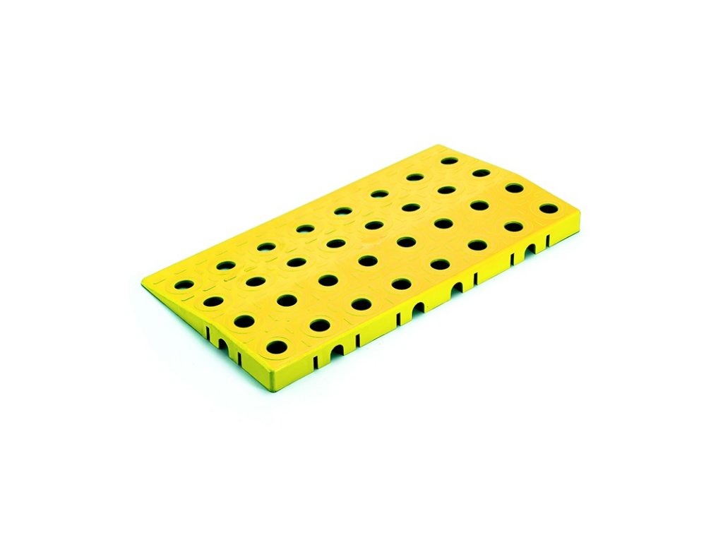 Nájezd rovný 250x137x16 mm slouží pro ukončení plastové podlahové plochy po stranách. Plynulý nájezd zabezpečí bezpečný vstup a nájezd na plochu. Povrch nájezdu je stejně děrovaný jako základní deska, spodní strana je žebrovaná a propojená kanály, které zajišťují rychlý a trvalý odvod vody pod povrchem podlahy. Barevnou kombinací nájezdů je možné současně označit okraje plochy v souladu s bezpečnostními předpisy (kombinace žluté a černé). Součástí dodávky jsou 6x4 spojky pro spojení s dalšími prvky. Výhodou systému je, že při poškození spojky se tato jednoduše vymění a nemusí se měnit celý díl. Na okraj dlouhý 1 metr jsou zapotřebí 4 ks nájezdů.