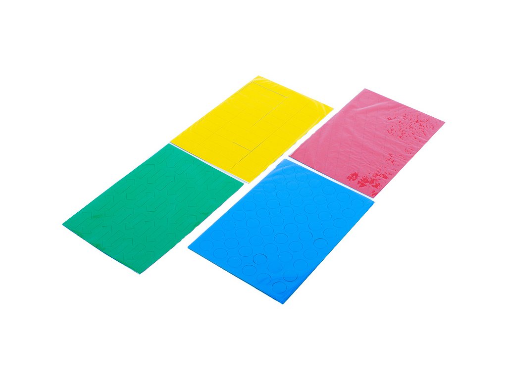 - čtyři barevné archy ze speciální magnetické fólie: žlutá (obdelníky), červená (trojúhelníky), modrá (kolečka), zelená (šipky)