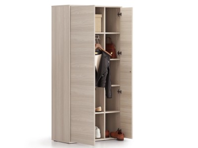 Šatní skříně BLOCK poskytují praktickou kombinaci prostoru pro uložení nejen pracovních oděvů, kabátů, ale i osobních věcí. Součástí vnitřního vybavení je výsuvný věšák o hloubce 300 mm v provedení chrom / černá a 6 polic. Police jsou vyrobeny z laminované dřevotřísky o tloušťce 18 mm s 1 mm ABS hranou v barvě dezénu a uloženy na kovových čepech. Každou polici lze navíc výškově přestavovat v 5 polohách v rastru co 32 mm. Pohodlně do nich tak vyskládáte například všechny své kancelářské šanony. Nosnost jedné police je 20 kg při rovnoměrném zatížení.