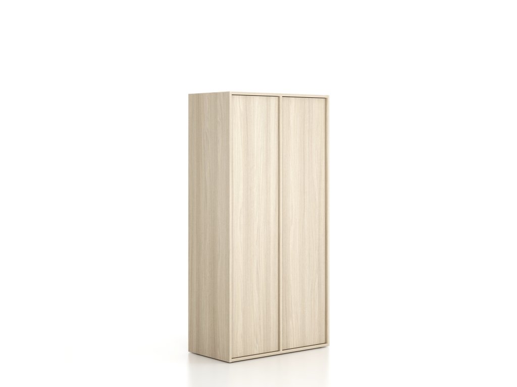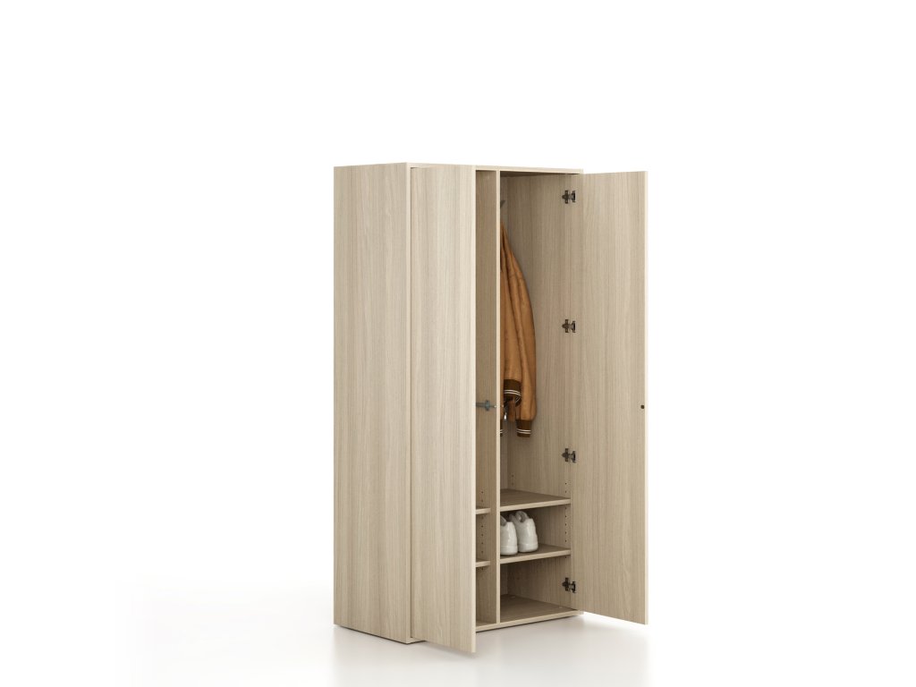 Šatní skříň FRAME se 2 oddíly je praktickým řešením pro ukládání oděvů, obuvi i osobních věcí dvou osob. Police z laminované dřevotřísky o síle 18 mm s ABS hranou v barvě dezénu zajišťují odolnost a dlouhou životnost při každodenním používání. Každý oddíl je vybaven dvojicí háčků na zadní stěně a dvěma spodními policemi. Vzdálenost mezi policemi činí 195,5 mm a každá z nich unese až 30 kg při rovnoměrném zatížení. Díky čistému a funkčnímu členění skříň snadno zapadne do moderní kanceláře i zázemí zaměstnanců.