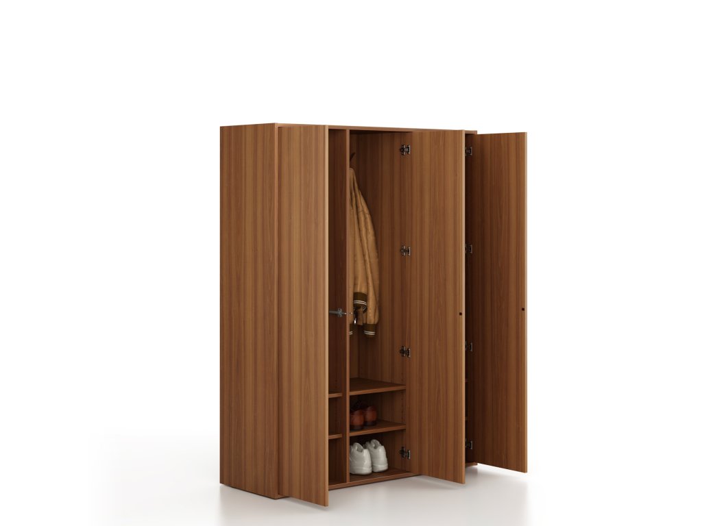 Šatní skříň FRAME se 3 oddíly nabízí více prostoru pro oděvy a osobní věci několika uživatelů. Police z laminované dřevotřísky o síle 18 mm s ABS hranou v barvě dezénu zajišťují odolnost a dlouhou životnost při každodenním používání. Každý oddíl je vybaven dvojicí háčků na zadní stěně a dvěma spodními policemi. Vzdálenost mezi policemi činí 195,5 mm a každá z nich unese až 30 kg při rovnoměrném zatížení. Díky čistému a funkčnímu členění skříň snadno zapadne do moderní kanceláře i menšího zázemí zaměstnanců.