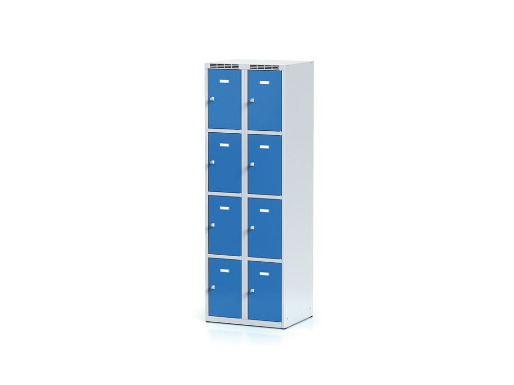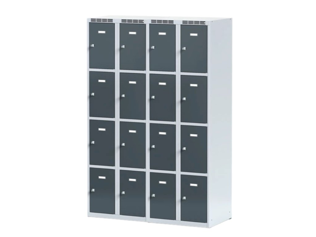 Skříňku s šířkou 300 mm tvoří 8 uzamykatelných boxů. Každý box poskytuje dostatek místa pro uložení osobních věcí, batohů či tašek. Toto úsporné a přitom bezpečné, uzamykatelné řešení je ideální všude tam, kde je potřeba šetřit místem a zároveň není nutné zavěšovat delší oděvy.