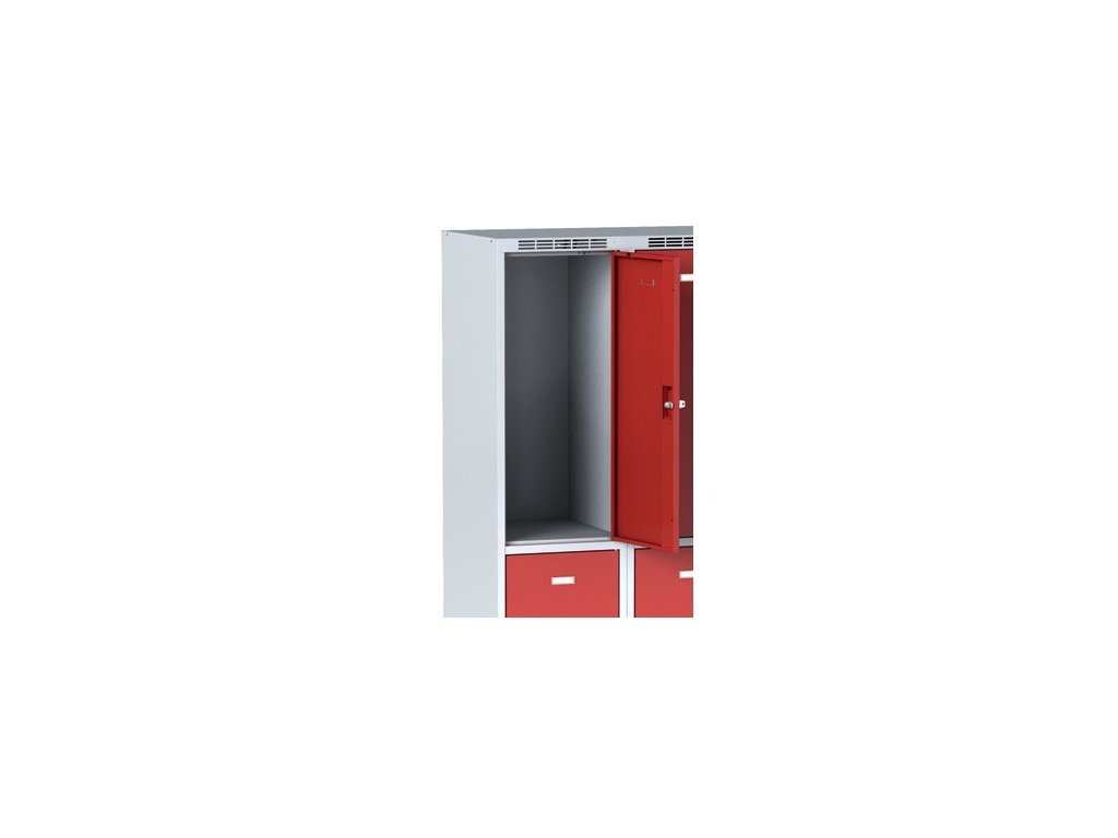 Potřebujete umístit větší množství šatních skříněk pro zaměstnance, návštěvníky, žáky či studenty a máte k dispozici omezené prostory? Řešením jsou šatní skříňky se 2 oddíly nad sebou. Tyto skříňky se skvěle hodí například do škol, sportovních hal, fitcenter, kde se nepředpokládá skladování pracovního oblečení. Každý oddíl je vysoký cca 850 mm a je vybaven šatní tyčí se 2 háčky. Dokoupit lze i přídavnou polici.