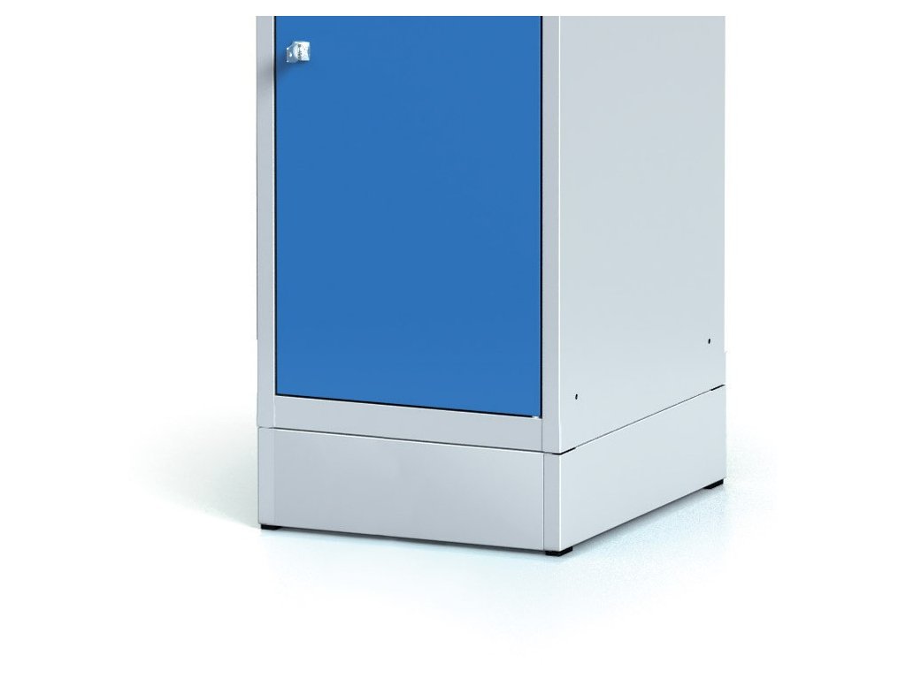 Základna skříňky je tvořena přídavným soklem, jehož výška 12 cm je již zohledněna v celkové výšce skříňky. Přídavný sokl je osazen plastovými patkami, které brání přímému kontaktu plechu s podlahou a omezují možný vznik rezavých fleků na podlaze nebo korozi skříně.