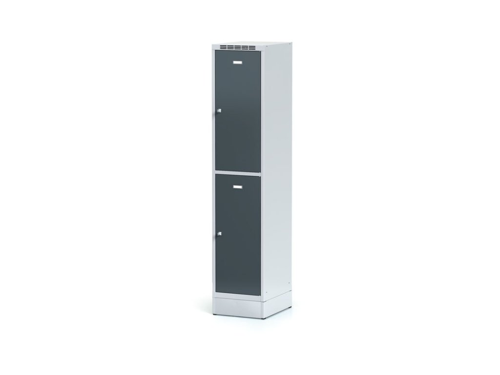 Šatní skříňka S6 s úložnými boxy na soklu, 2 boxy, 1920 x 400 x 500 mm, otočný zámek, tmavě šedé dveře