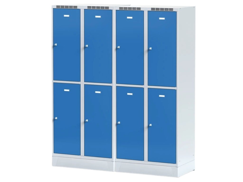 Potřebujete umístit větší množství šatních skříněk pro zaměstnance, návštěvníky, žáky či studenty a máte k dispozici omezené prostory? Řešením jsou šatní skříňky se 2 oddíly nad sebou. Tyto skříňky se skvěle hodí například do škol, sportovních hal, fitcenter, kde se nepředpokládá skladování pracovního oblečení. Každý oddíl je vysoký cca 850 mm a je vybaven šatní tyčí se 2 háčky. Dokoupit lze i přídavnou polici.