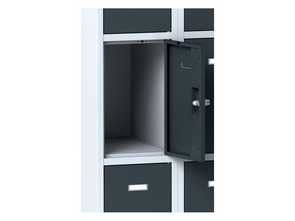 Skříňku s šířkou 300 mm tvoří 8 uzamykatelných boxů. Každý box poskytuje dostatek místa pro uložení osobních věcí, batohů či tašek. Toto úsporné a přitom bezpečné, uzamykatelné řešení je ideální všude tam, kde je potřeba šetřit místem a zároveň není nutné zavěšovat delší oděvy.