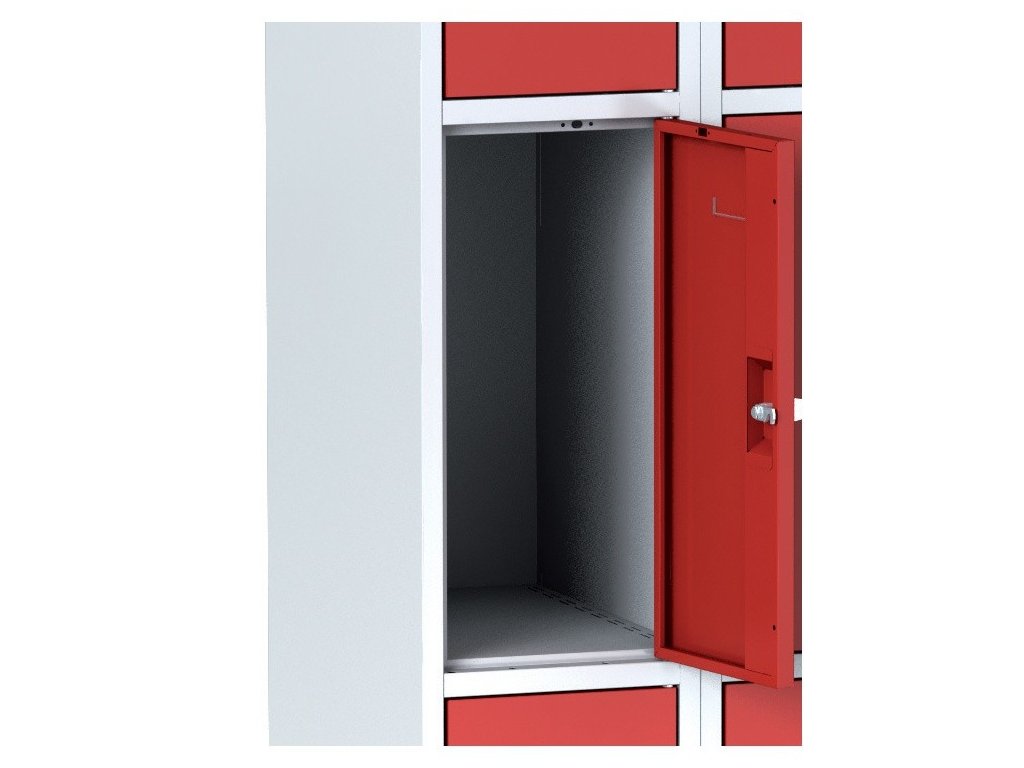 Skříňku s šířkou 300 mm tvoří 9 uzamykatelných boxů. Každý box poskytuje dostatek místa pro uložení osobních věcí, batohů či tašek. Toto úsporné a přitom bezpečné, uzamykatelné řešení je ideální všude tam, kde je potřeba šetřit místem a zároveň není nutné zavěšovat delší oděvy.
