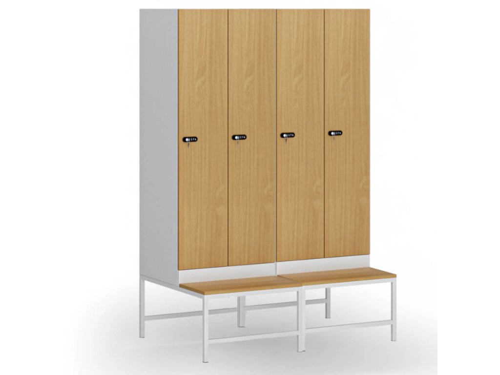 Šatní skříňka S1 s lavičkou, 2 oddíly, 1875 x 600 x 500/800 mm, demont, mechanický kódový zámek, laminované dveře, buk