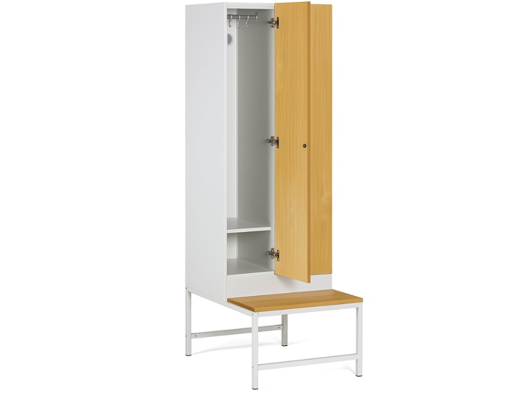 Kombinace lavičky vysoké 375 mm a soklu s výškou 100 mm pevně spojeného s korpusem skříňky kombinuje tepelnou ochranu i pohodlné sezení. Sokl zlepšuje tepelnou izolaci od země, brání usazování prachu a vlhkosti, lavička zajišťuje pohodlí při převlékání přímo u skříňky.