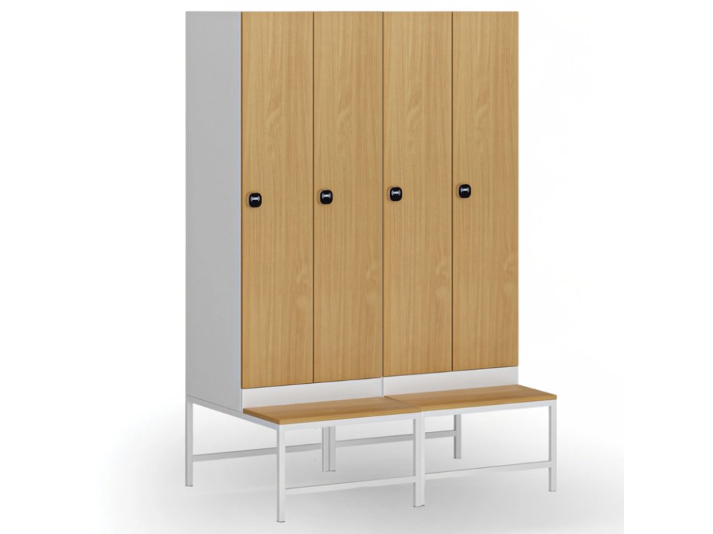 Kombinace lavičky vysoké 375 mm a soklu s výškou 100 mm pevně spojeného s korpusem skříňky kombinuje tepelnou ochranu i pohodlné sezení. Sokl zlepšuje tepelnou izolaci od země, brání usazování prachu a vlhkosti, lavička zajišťuje pohodlí při převlékání přímo u skříňky.