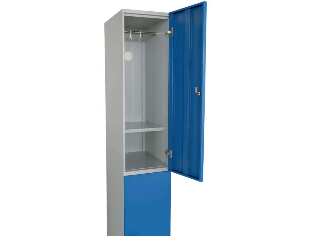 Skříňku s šířkou 300 mm tvoří 2 uzamykatelné boxy. Každý box poskytuje dostatek místa pro uložení osobních věcí, batohů či tašek. Toto úsporné a přitom bezpečné, uzamykatelné řešení je ideální všude tam, kde je potřeba šetřit místem a zároveň není nutné zavěšovat delší oděvy.