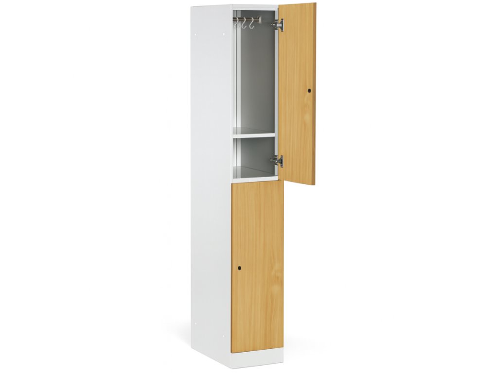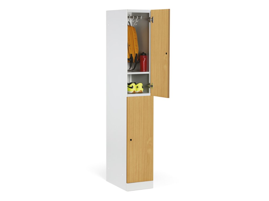 Skříňku s šířkou 300 mm tvoří 2 uzamykatelné boxy. Každý box poskytuje dostatek místa pro uložení osobních věcí, batohů či tašek. Toto úsporné a přitom bezpečné, uzamykatelné řešení je ideální všude tam, kde je potřeba šetřit místem a zároveň není nutné zavěšovat delší oděvy.