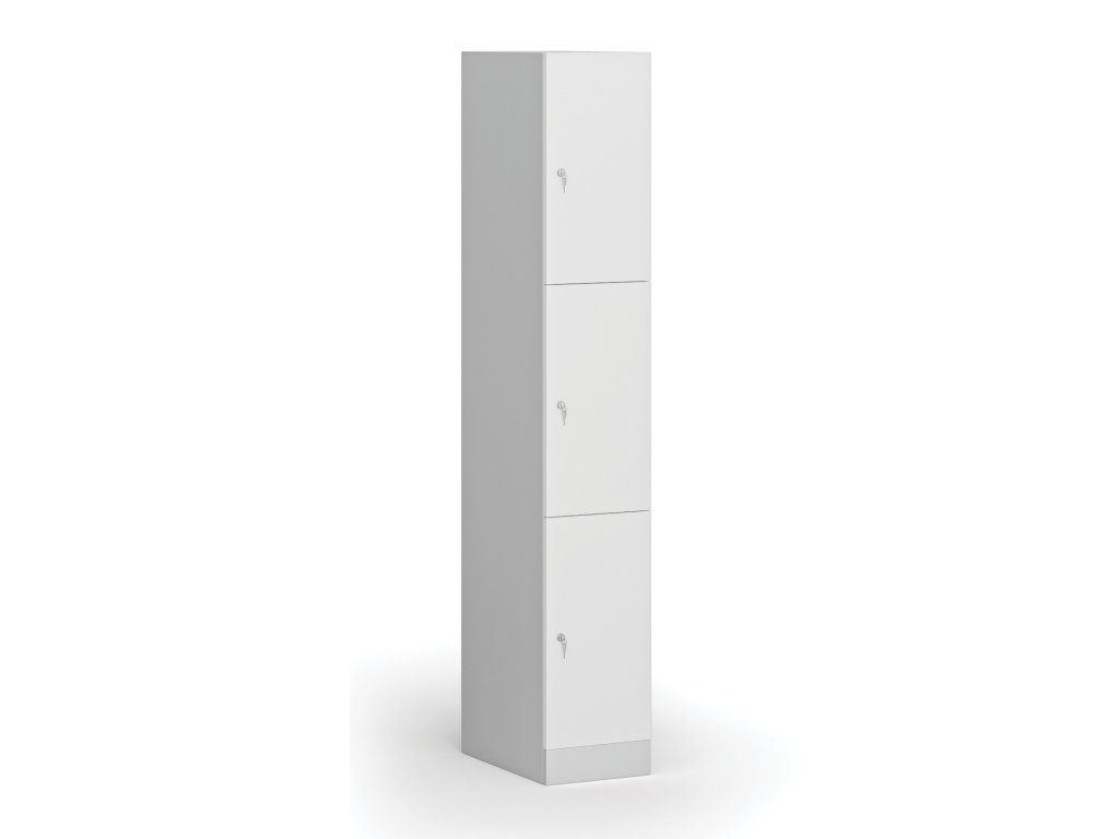 Skříňku s šířkou 300 mm tvoří 3 uzamykatelné boxy. Každý box poskytuje dostatek místa pro uložení osobních věcí, batohů či tašek. Toto úsporné a přitom bezpečné, uzamykatelné řešení je ideální všude tam, kde je potřeba šetřit místem a zároveň není nutné zavěšovat delší oděvy.