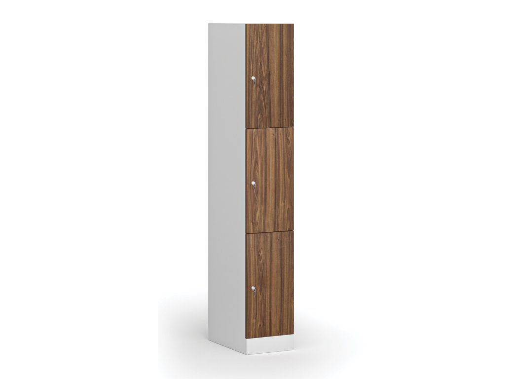 Šatní skříňka S1 s úložnými boxy, 3 boxy, 1850 x 300 x 500 mm, demont, cylindrický zámek, laminované dveře, ořech