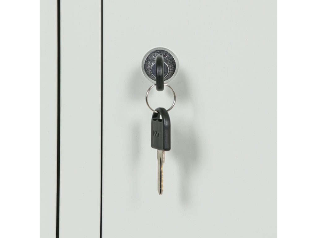 Dveře snadno uzamknete pomocí cylindrického zámku na klíč. Standardně jej dodáváme se 2 klíči v balení. Tento typ zámku je běžnou volbou pro individuálně přidělené skříňky.