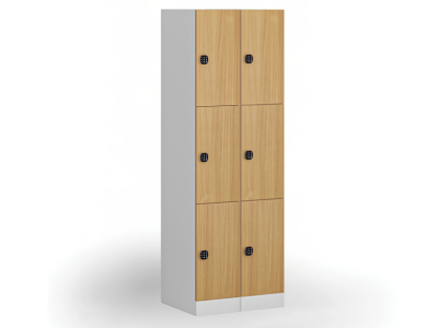 Kovová šatní skříňka s laminovanými dveřmi představuje elegantní kompromis - spojuje maximální odolnost ocelové konstrukce (0,6 mm) s reprezentativností dřeva.