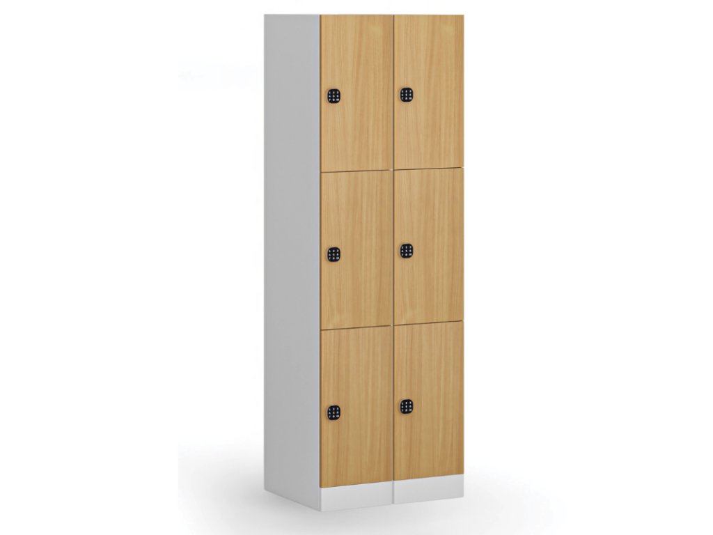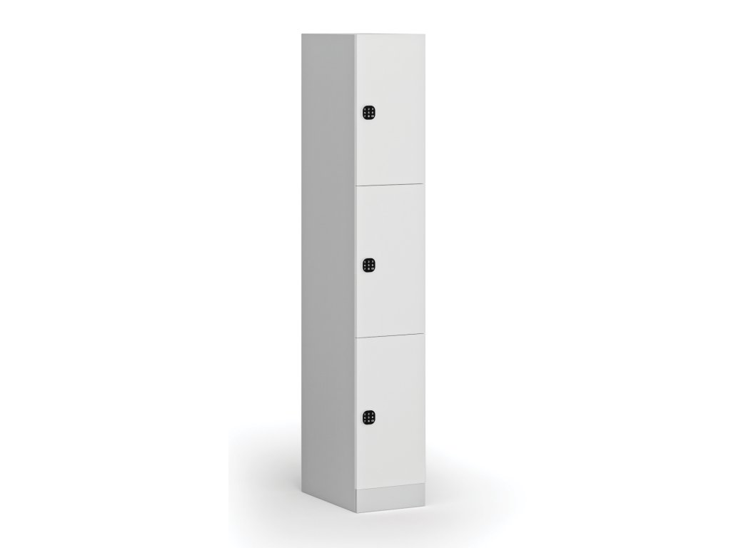 Skříňku s šířkou 300 mm tvoří 3 uzamykatelné boxy. Každý box poskytuje dostatek místa pro uložení osobních věcí, batohů či tašek. Toto úsporné a přitom bezpečné, uzamykatelné řešení je ideální všude tam, kde je potřeba šetřit místem a zároveň není nutné zavěšovat delší oděvy.