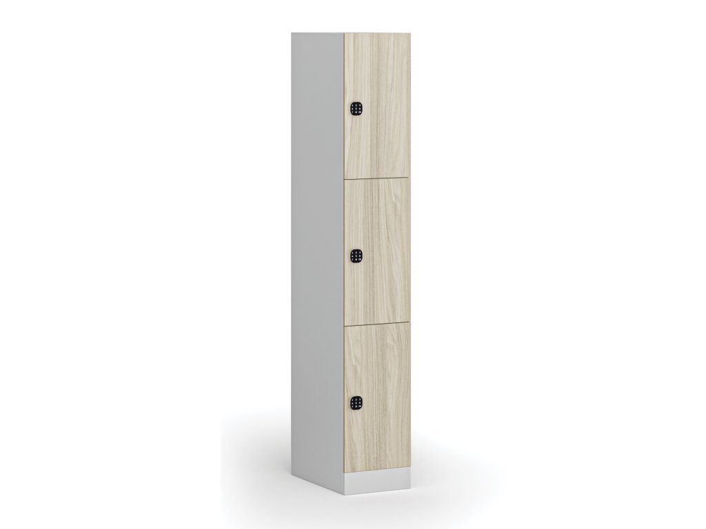 Skříňku s šířkou 300 mm tvoří 3 uzamykatelné boxy. Každý box poskytuje dostatek místa pro uložení osobních věcí, batohů či tašek. Toto úsporné a přitom bezpečné, uzamykatelné řešení je ideální všude tam, kde je potřeba šetřit místem a zároveň není nutné zavěšovat delší oděvy.