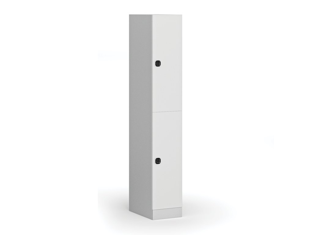 Skříňku s šířkou 300 mm tvoří 2 uzamykatelné boxy. Každý box poskytuje dostatek místa pro uložení osobních věcí, batohů či tašek. Toto úsporné a přitom bezpečné, uzamykatelné řešení je ideální všude tam, kde je potřeba šetřit místem a zároveň není nutné zavěšovat delší oděvy.