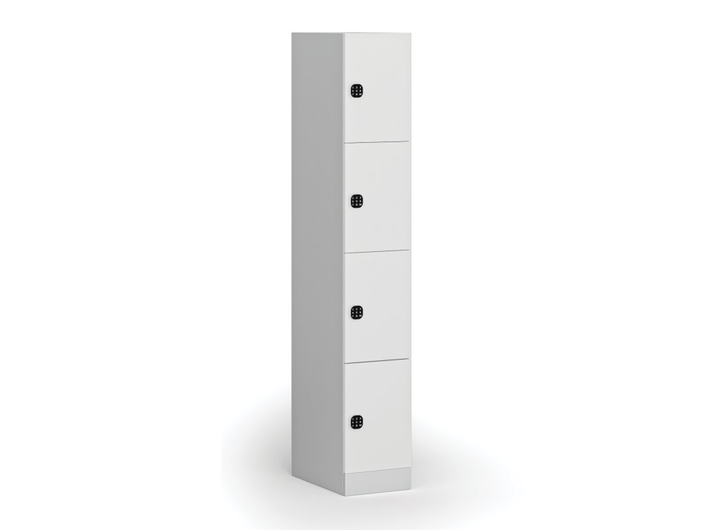 Skříňku s šířkou 300 mm tvoří 4 uzamykatelné boxy. Každý box poskytuje dostatek místa pro uložení osobních věcí, batohů či tašek. Toto úsporné a přitom bezpečné, uzamykatelné řešení je ideální všude tam, kde je potřeba šetřit místem a zároveň není nutné zavěšovat delší oděvy.