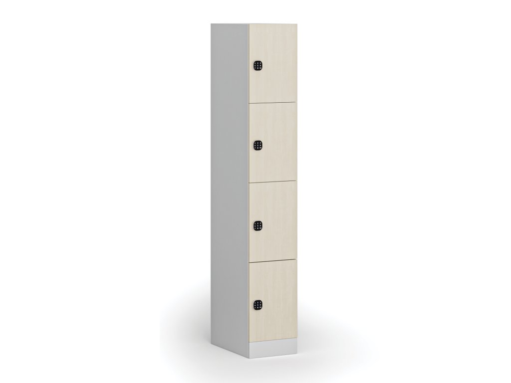 Šatní skříňka S1 s úložnými boxy, 4 boxy, 1850 x 300 x 500 mm, kódový zámek, laminované dveře, bříza