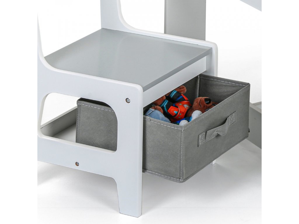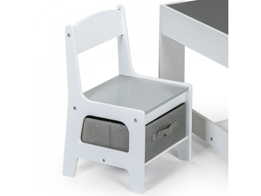 Nespornou výhodou tohoto modelu jsou praktické úložné prostory ve formě látkových boxů, které se nacházejí ve spodní části židliček. Ty mohou sloužit například pro odložení oblíbených hraček. Originální řešení představuje i odnímatelná pracovní deska stolečku, která je z jedné strany bílá a ze strany druhé slouží jako černá tabule, na kterou lze psát křídou.