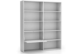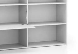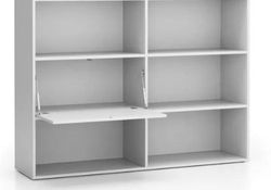 Kancelářský regál je místy doplněn i o boxy s vyklopným mechanismem dvířek, které se otevírají směrem dolů. Pokud byste výklopná dvířka, chtěli doplnit i do ostatních polic, můžete je snadno dokoupit i samostatně.