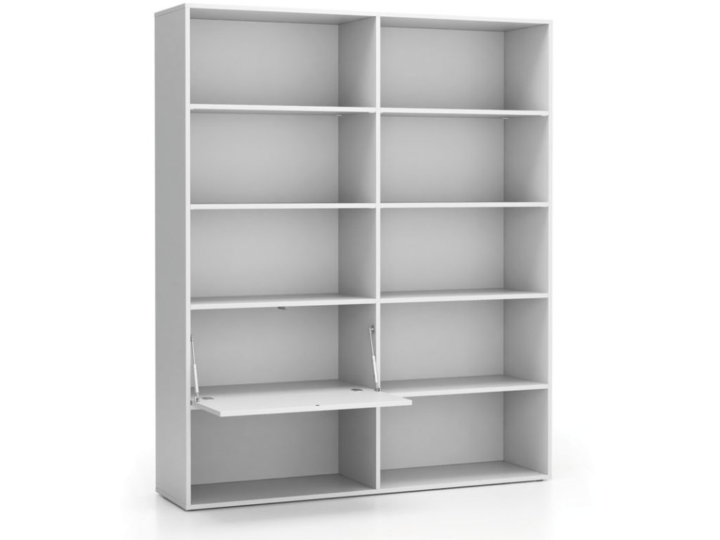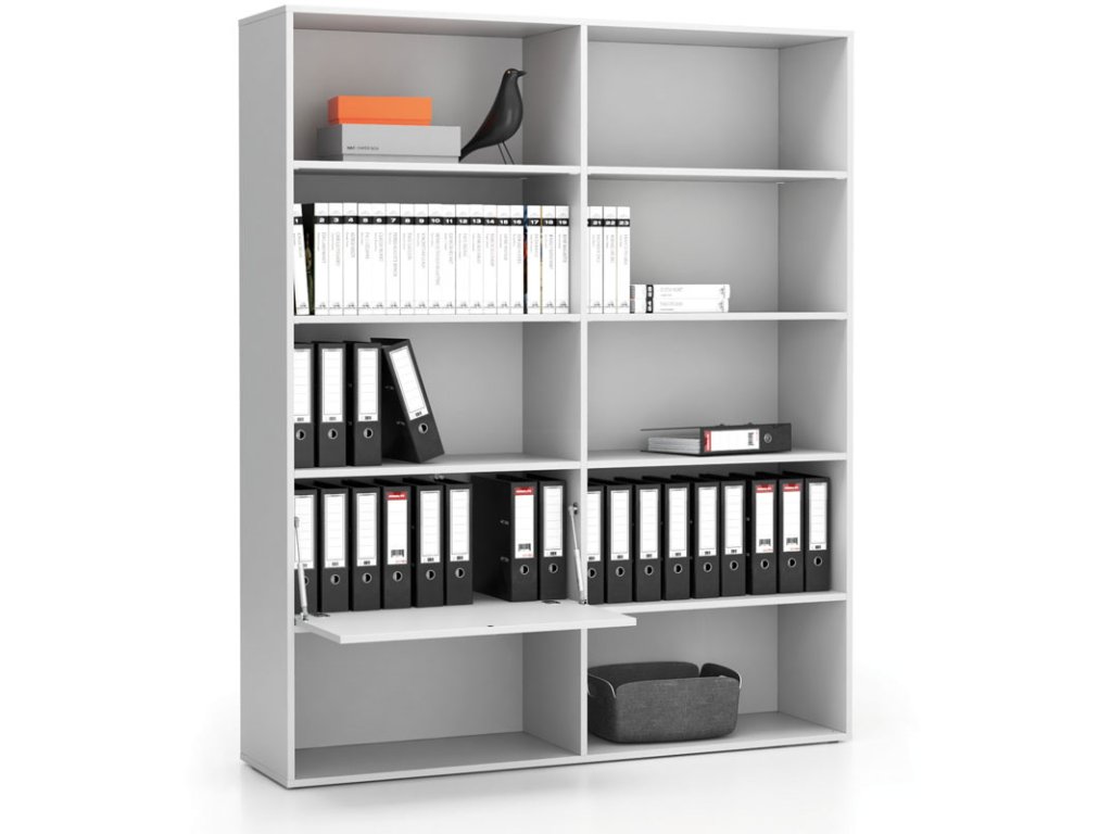 Kancelářský regál je místy doplněn i o boxy s vyklopným mechanismem dvířek, které se otevírají směrem dolů. Pokud byste výklopná dvířka, chtěli doplnit i do ostatních polic, můžete je snadno dokoupit i samostatně.