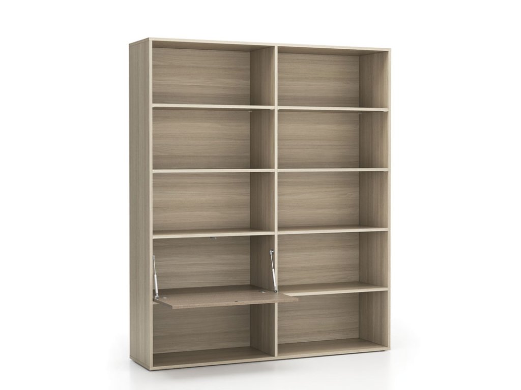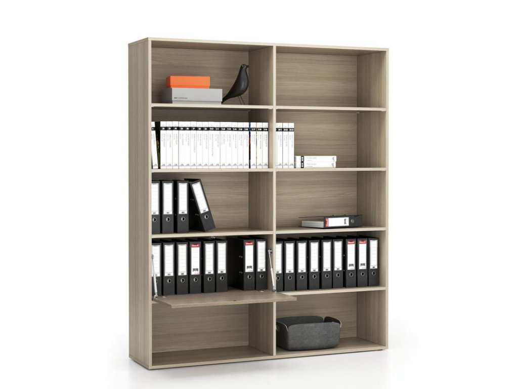 Kancelářský regál je místy doplněn i o boxy s vyklopným mechanismem dvířek, které se otevírají směrem dolů. Pokud byste výklopná dvířka, chtěli doplnit i do ostatních polic, můžete je snadno dokoupit i samostatně.