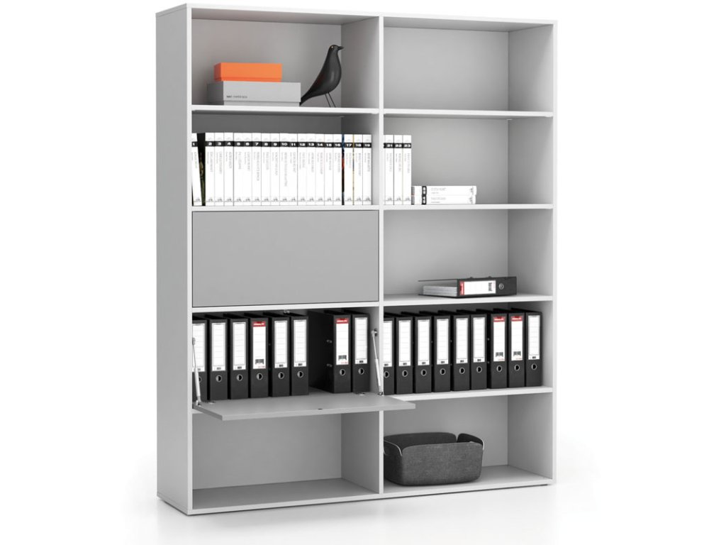 Kancelářský regál je místy doplněn i o boxy s vyklopným mechanismem dvířek, které se otevírají směrem dolů. Pokud byste výklopná dvířka, chtěli doplnit i do ostatních polic, můžete je snadno dokoupit i samostatně.