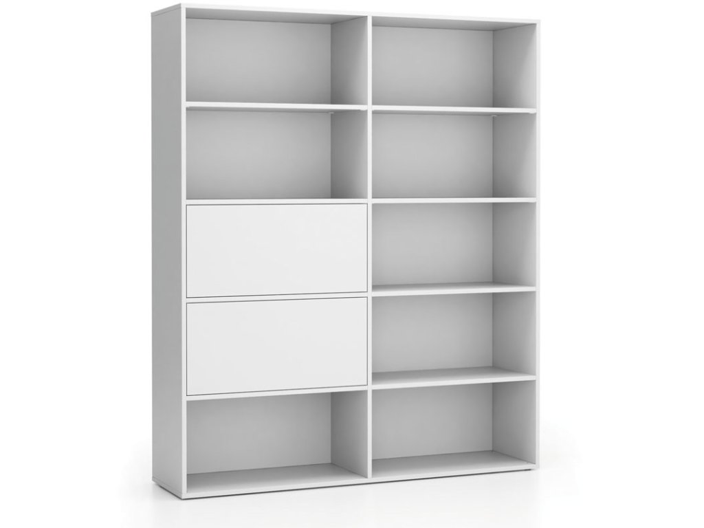 Kancelářský regál je místy doplněn i o boxy s vyklopným mechanismem dvířek, které se otevírají směrem dolů. Pokud byste výklopná dvířka, chtěli doplnit i do ostatních polic, můžete je snadno dokoupit i samostatně.