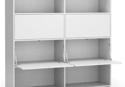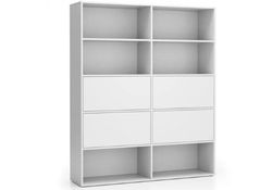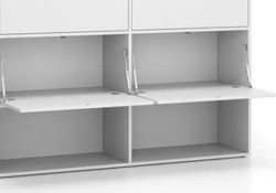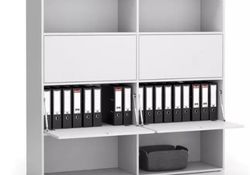 Kancelářský regál je místy doplněn i o boxy s vyklopným mechanismem dvířek, které se otevírají směrem dolů. Pokud byste výklopná dvířka, chtěli doplnit i do ostatních polic, můžete je snadno dokoupit i samostatně.