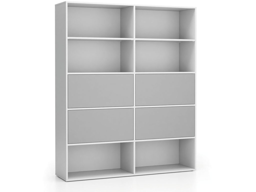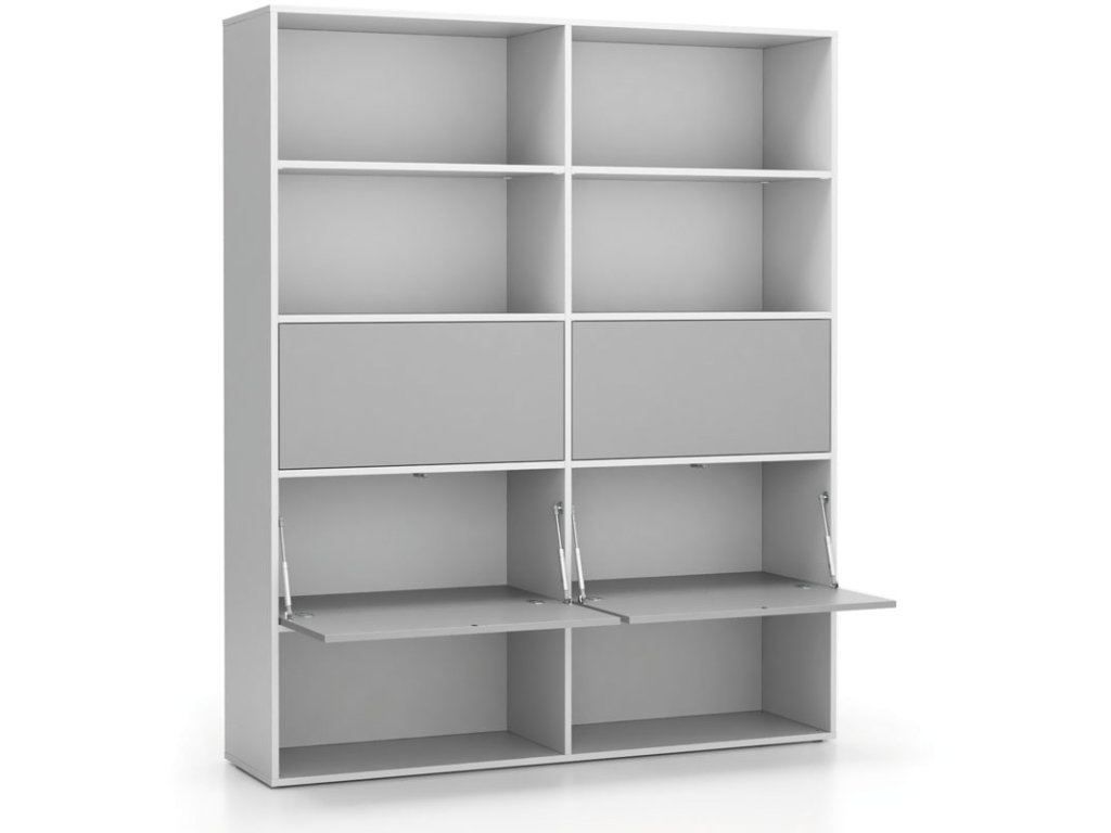 Kancelářský regál je místy doplněn i o boxy s vyklopným mechanismem dvířek, které se otevírají směrem dolů. Pokud byste výklopná dvířka, chtěli doplnit i do ostatních polic, můžete je snadno dokoupit i samostatně.