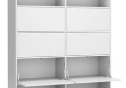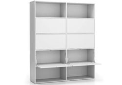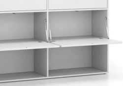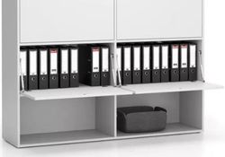 Kancelářský regál je místy doplněn i o boxy s vyklopným mechanismem dvířek, které se otevírají směrem dolů. Pokud byste výklopná dvířka, chtěli doplnit i do ostatních polic, můžete je snadno dokoupit i samostatně.
