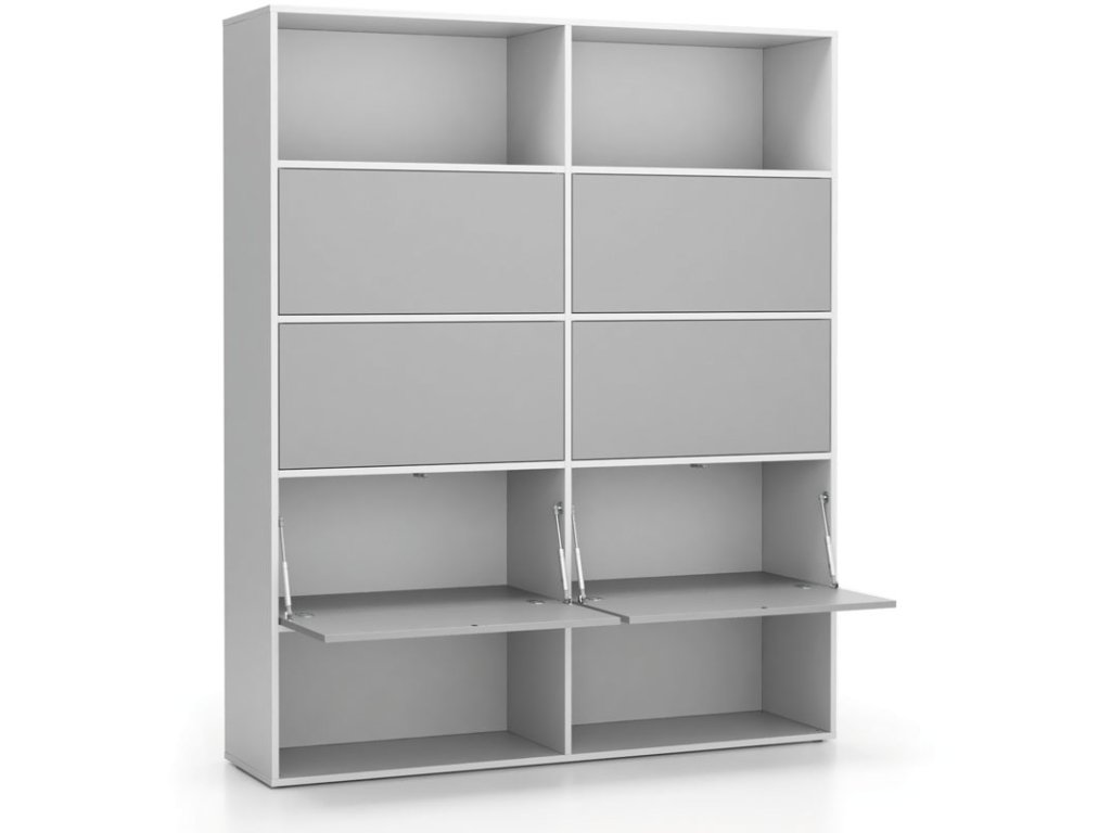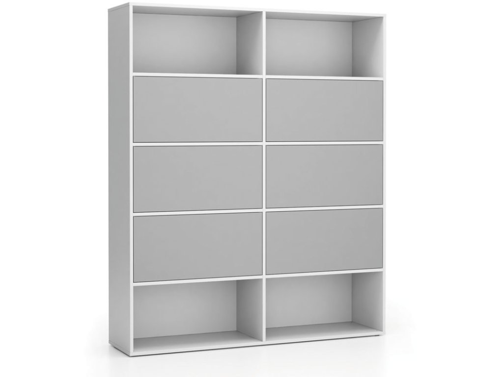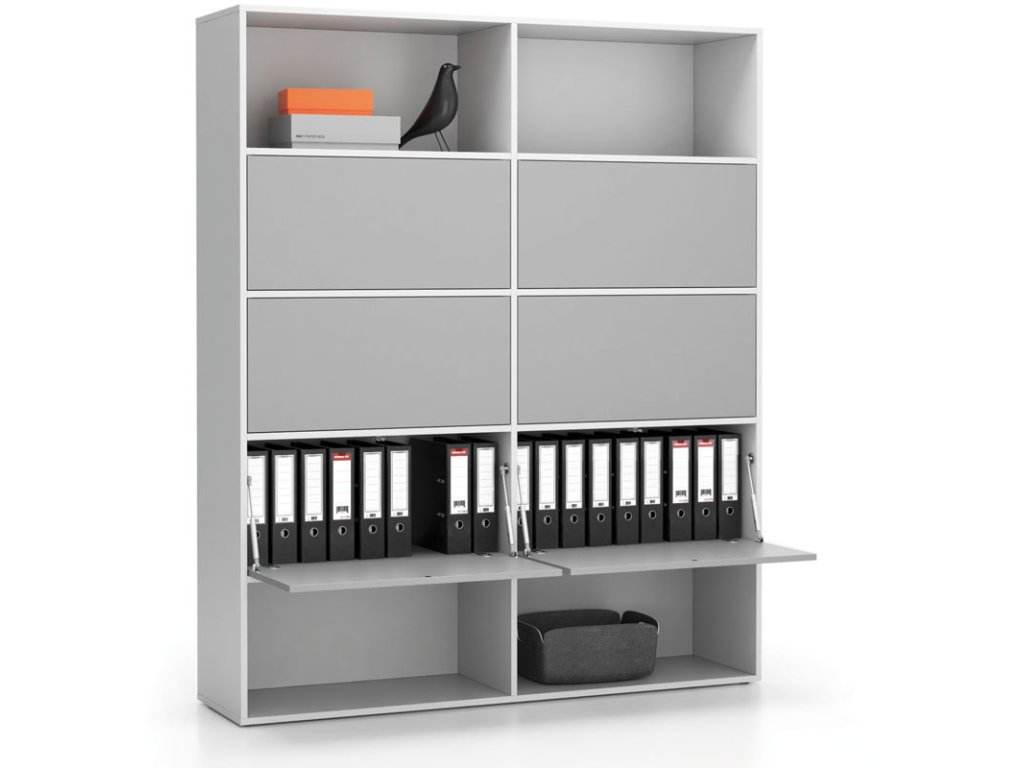 Kancelářský regál je místy doplněn i o boxy s vyklopným mechanismem dvířek, které se otevírají směrem dolů. Pokud byste výklopná dvířka, chtěli doplnit i do ostatních polic, můžete je snadno dokoupit i samostatně.