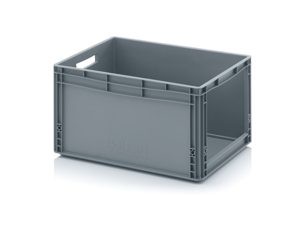 - skladovací plastové přepravky s otvorem na čelní (kratší) straně, který umožňuje jednotlivě i ve stohu pohodlně plnit i vyprazdňovat